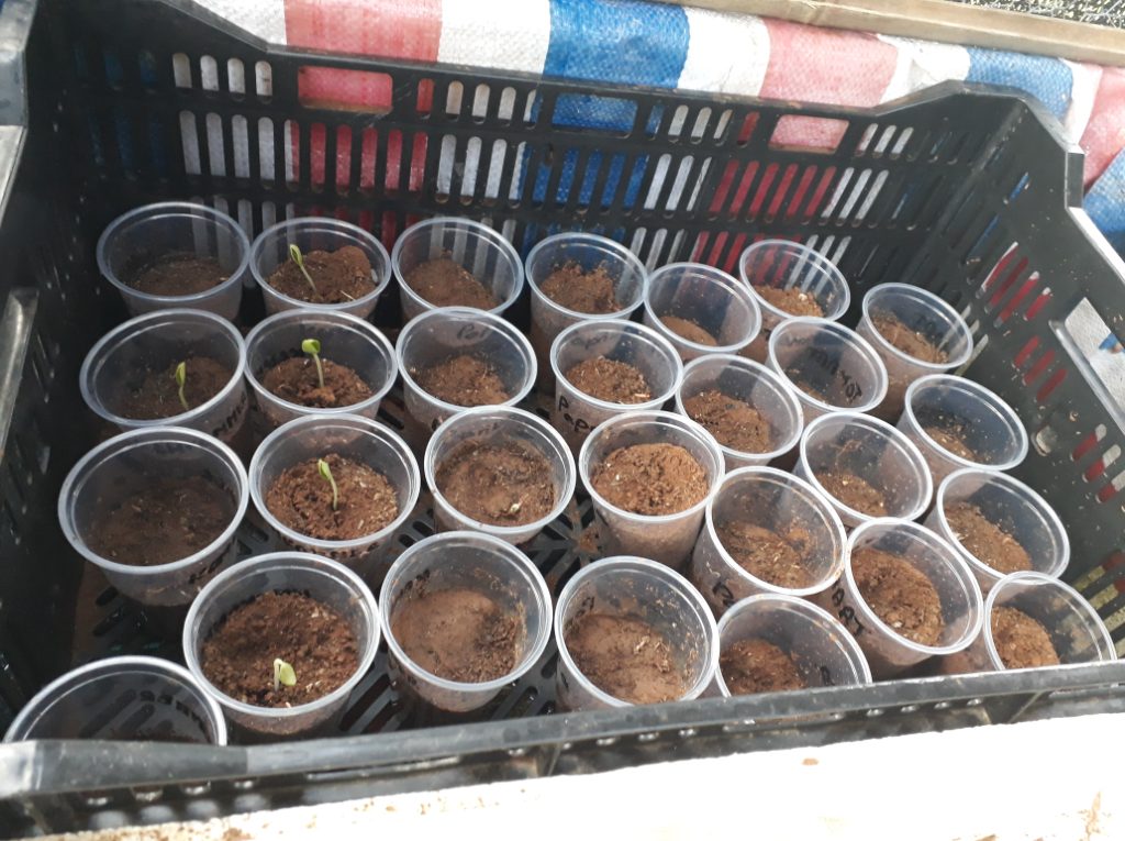 Vorige week zondag zijn Mike en ik begonnen om alvast wat zaadjes te planten. We hebben plastic bekers gekocht (onze bakken om in te zaaien, zitten nog in de container), aarde gehaald van de plantage in Band’abou en deze gezeefd zodat de aarde zo fijn mogelijk is. Elk bekertje kreeg wat aarde, wat water en uiteraard een zaadje. We hebben een deel van onze zaden-collectie al meegenomen en het andere deel zit nog in de container (die overigens al bijna op het eiland is).