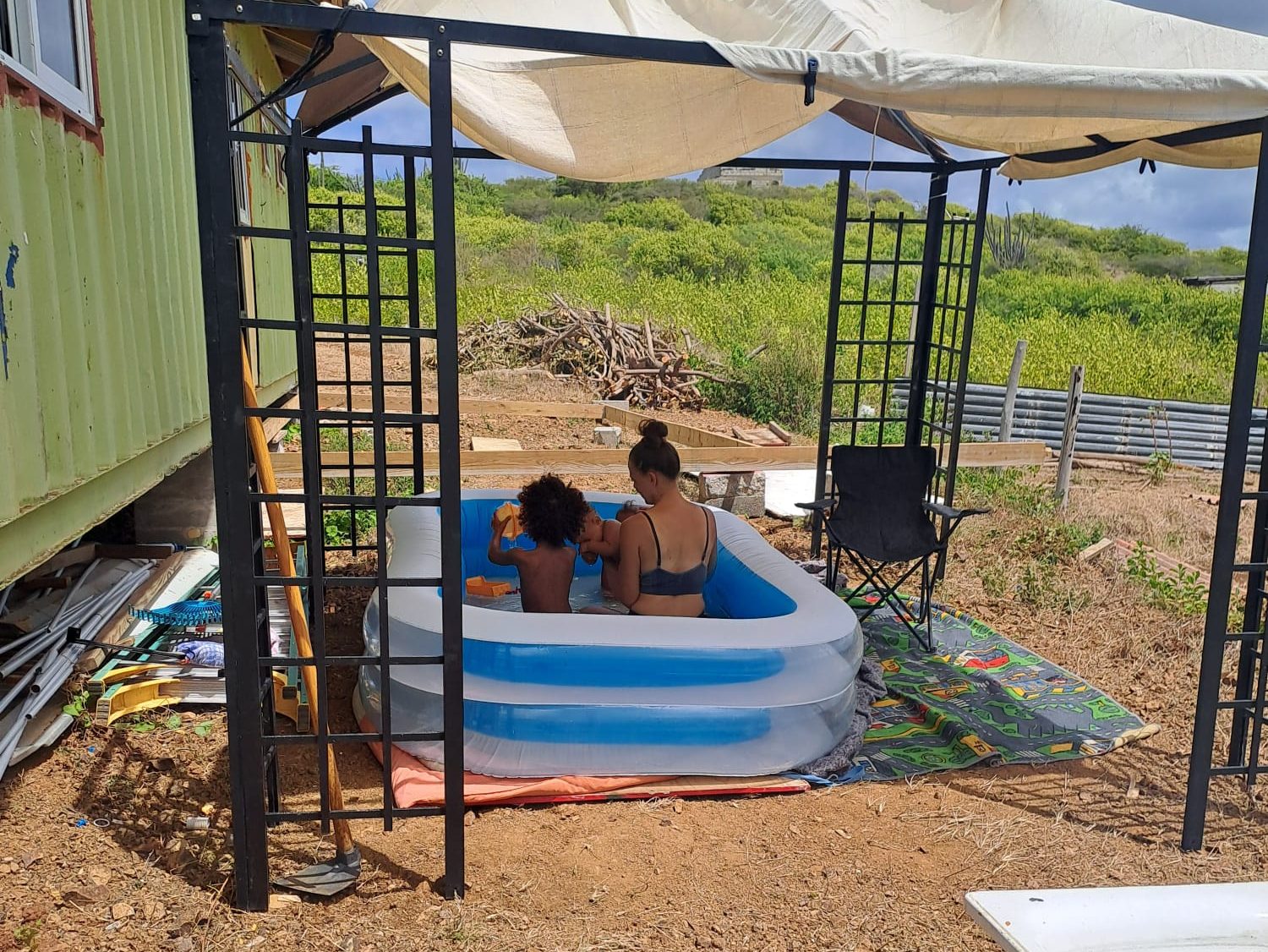 Hoe doen we dat nu dan? Terug naar de basis: we plassen op een emmer. Wel in de badkamer, dus dat voelt al wel een beetje alsof je een badkamer hebt, haha. En douchen doen we buiten, met een grote emmer water en een doucheslang die werkt met een kleine accu. Zo’n soort kraantje gebruiken we ook in de keuken om handen te wassen of borden af te spoelen.