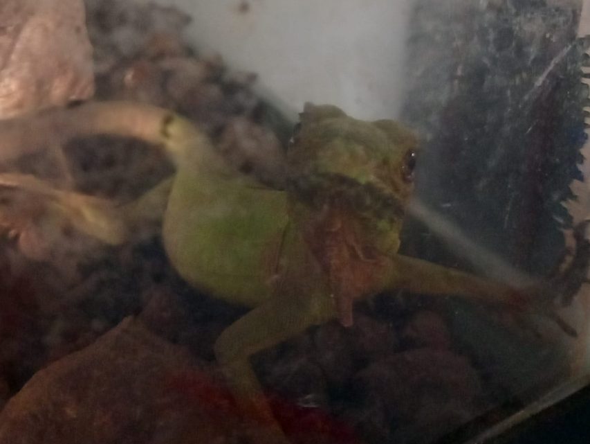 Helaas kroop-ie onder de kledingkast. Dus werd de bezem en een zaklamp erbij gehaald om dat beestje onder de kast uit te halen. Dat lukte ook weer en snel zette ik de bak erop. Helaas zat-ie er voor de helft onder, dus dat deed ‘m vast pijn, maar met de deksel kon ik hem er netjes inschuiven. Vervolgens hebben we de hele bak buiten gezet en dit keer bleef de baby-leguaan wel netjes buiten. Hij zat zelfs ’s ochtends nog voor de deur, maar toen een van de katten kwam, rende-ie snel weg.